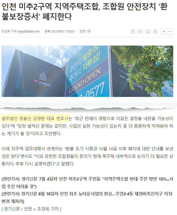 ÁöÁÖÅÃÀº ÀÎõ½Ã¿Í ¹ÌÃßȦ±¸ÀÇ ¹ÌÃß2±¸¿ª °³¹ß¹æÇâ °áÁ¤ Áö¿¬À¸·Î ÀÎÇÑ Á¶ÇÕ¿øµéÀÇ ºÒ¾È°¨ ÇØ¼Ò¿Í ¿øÈ°ÇÑ »ç¾÷ ÁøÇàÀ» À§ÇØ È¯ºÒº¸ÀåÁõ¼¸¦ Á¶±â ½ÇÇàÇÑ´Ù°í ¹àÇû´Ù.